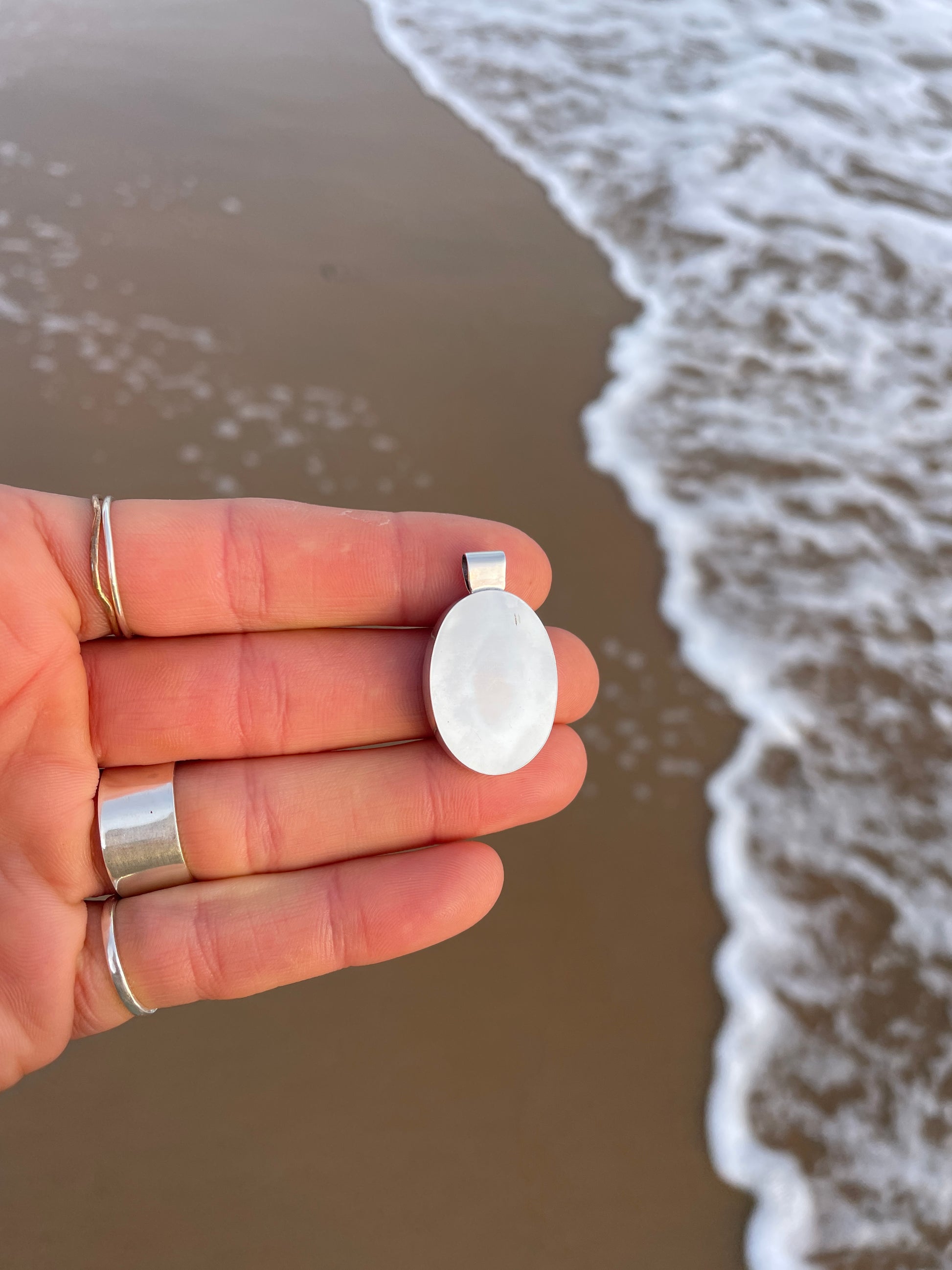 Blue paua shell set in a handmade 925 sterling silver pendant.