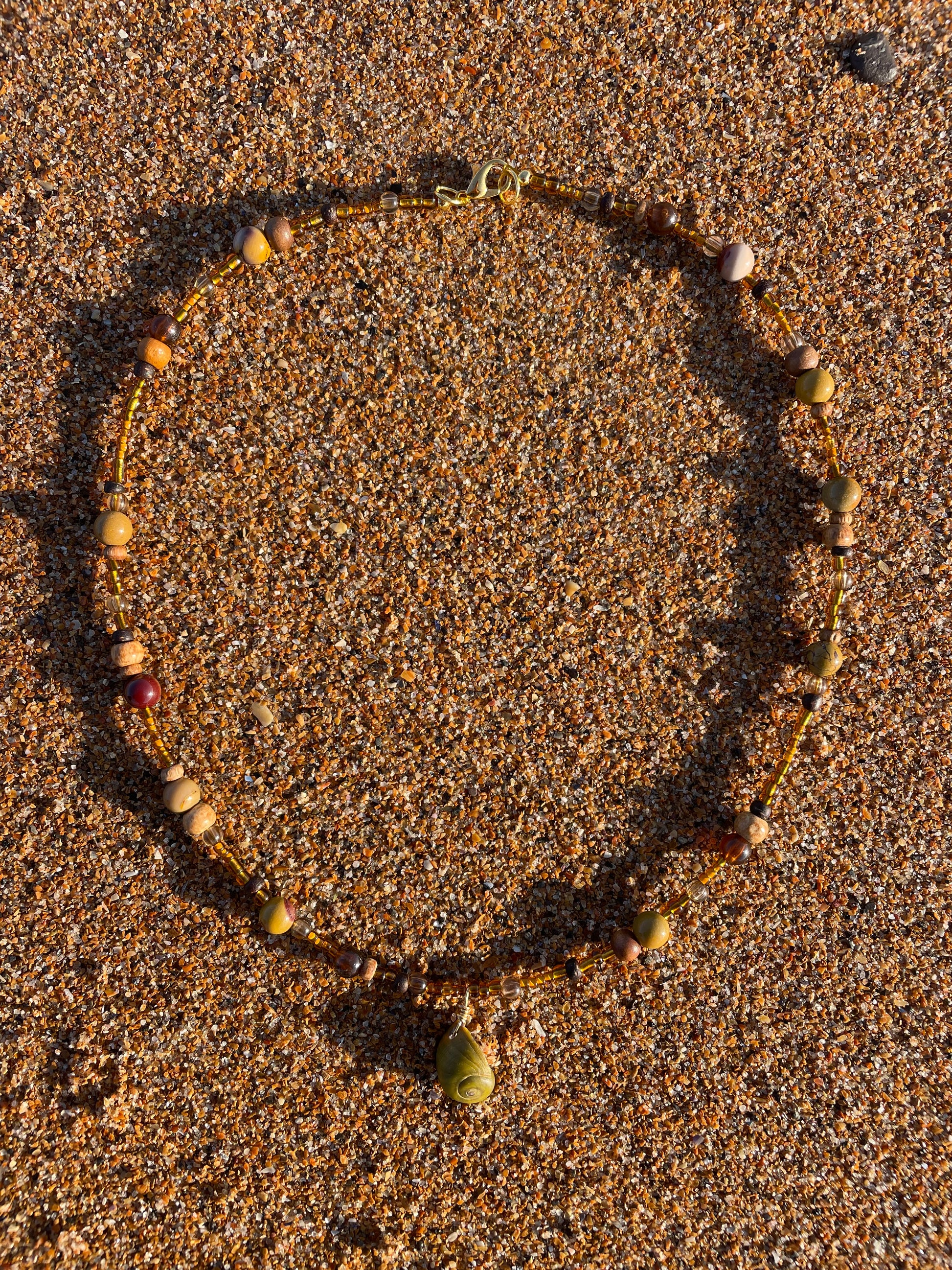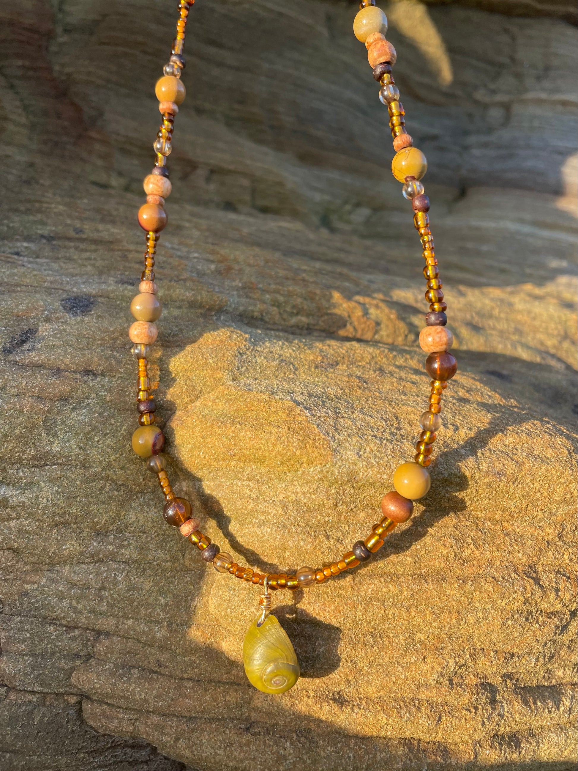 This necklace has been handmade with a gold plated lobster clasp, mini Sri Lankan prayer beads, semi-precious Mookaite, and a handpicked periwinkle.