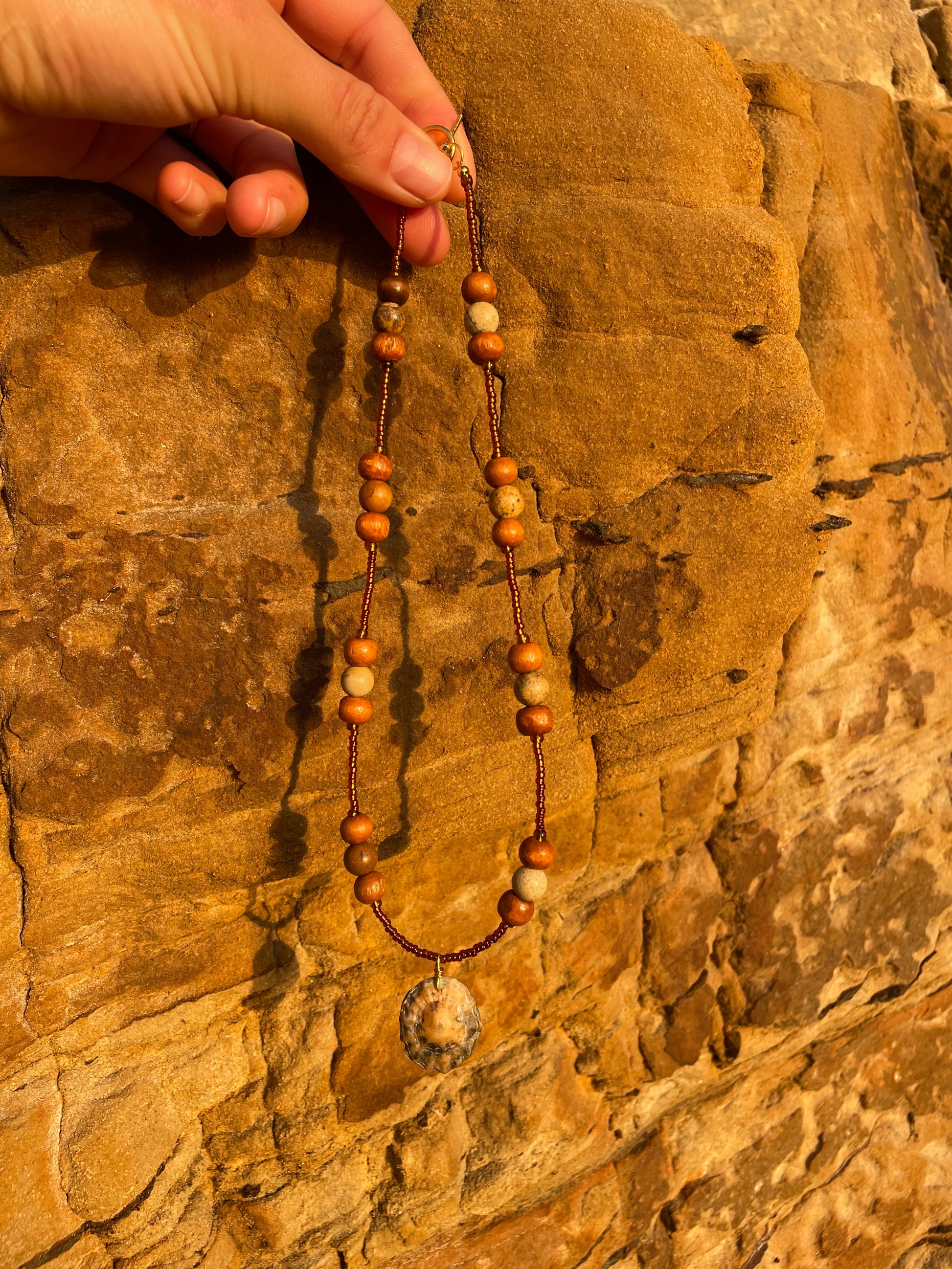 This necklace has been handmade with a gold plated lobster clasp, Sri Lankan prayer beads, semi-precious Picture Jasper, and a handpicked limpet.
