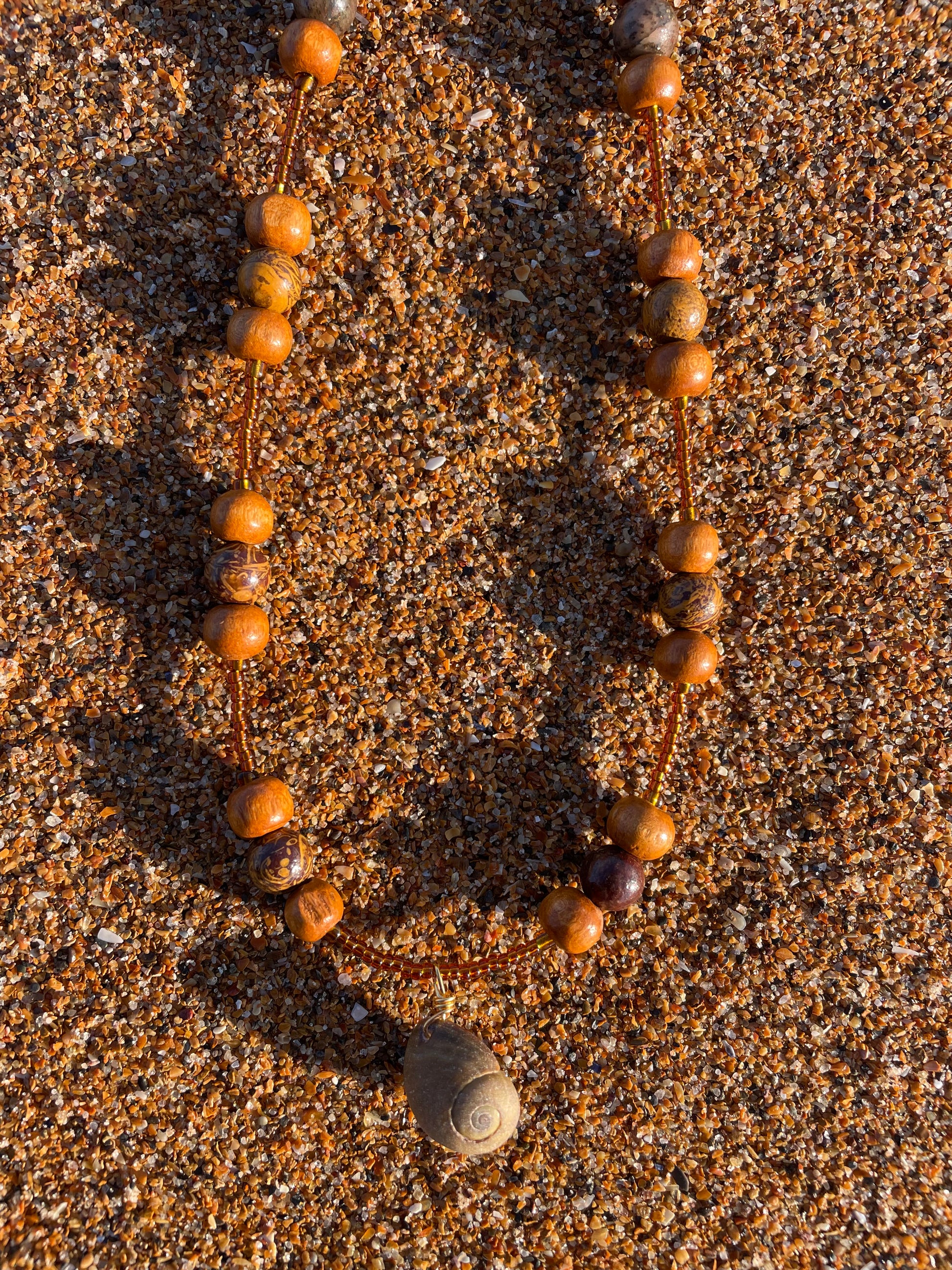 This necklace has been handmade with a gold plated lobster clasp, Sri Lankan prayer beads, semi-precious Picture Jasper, and a handpicked periwinkle.