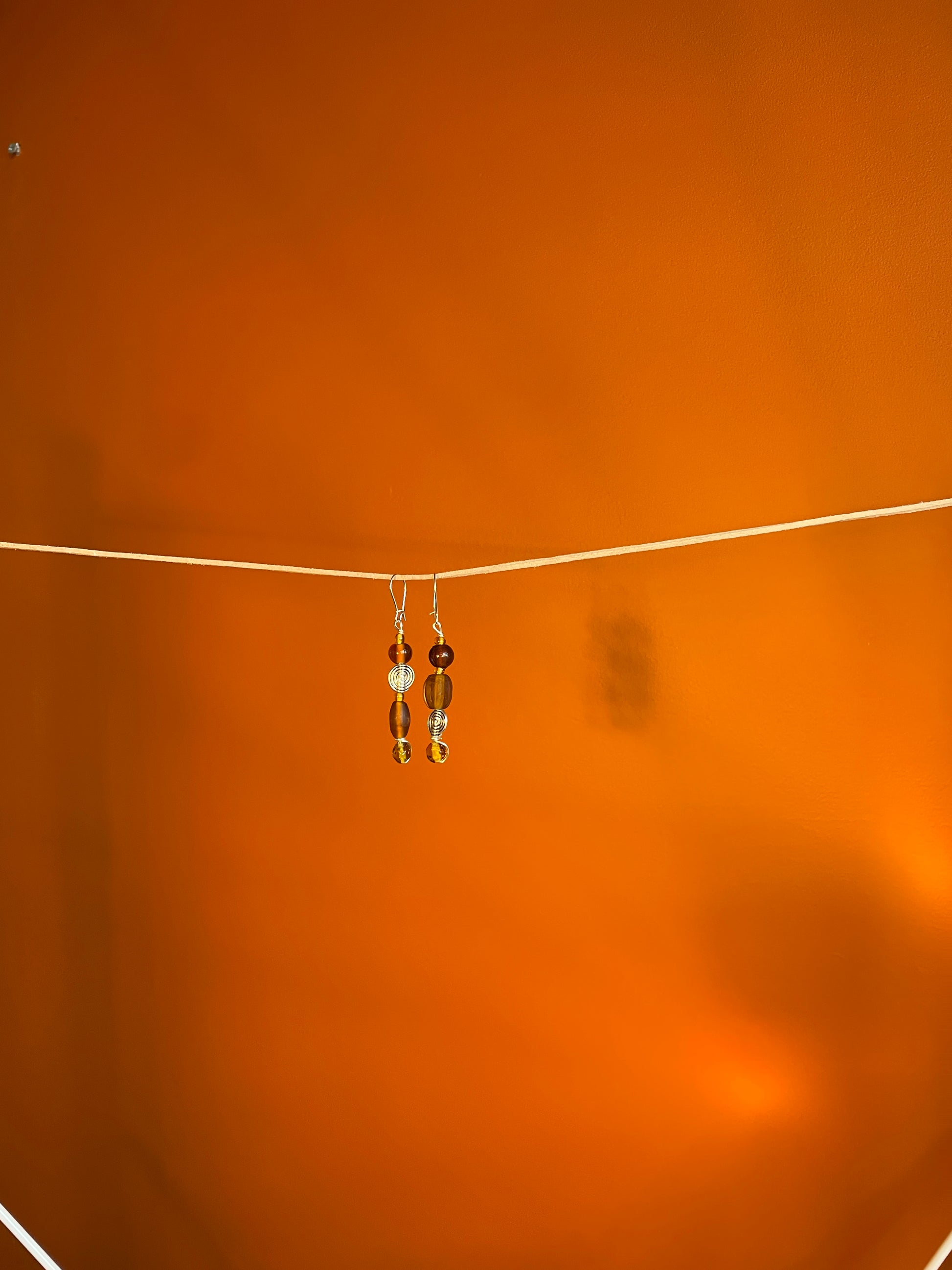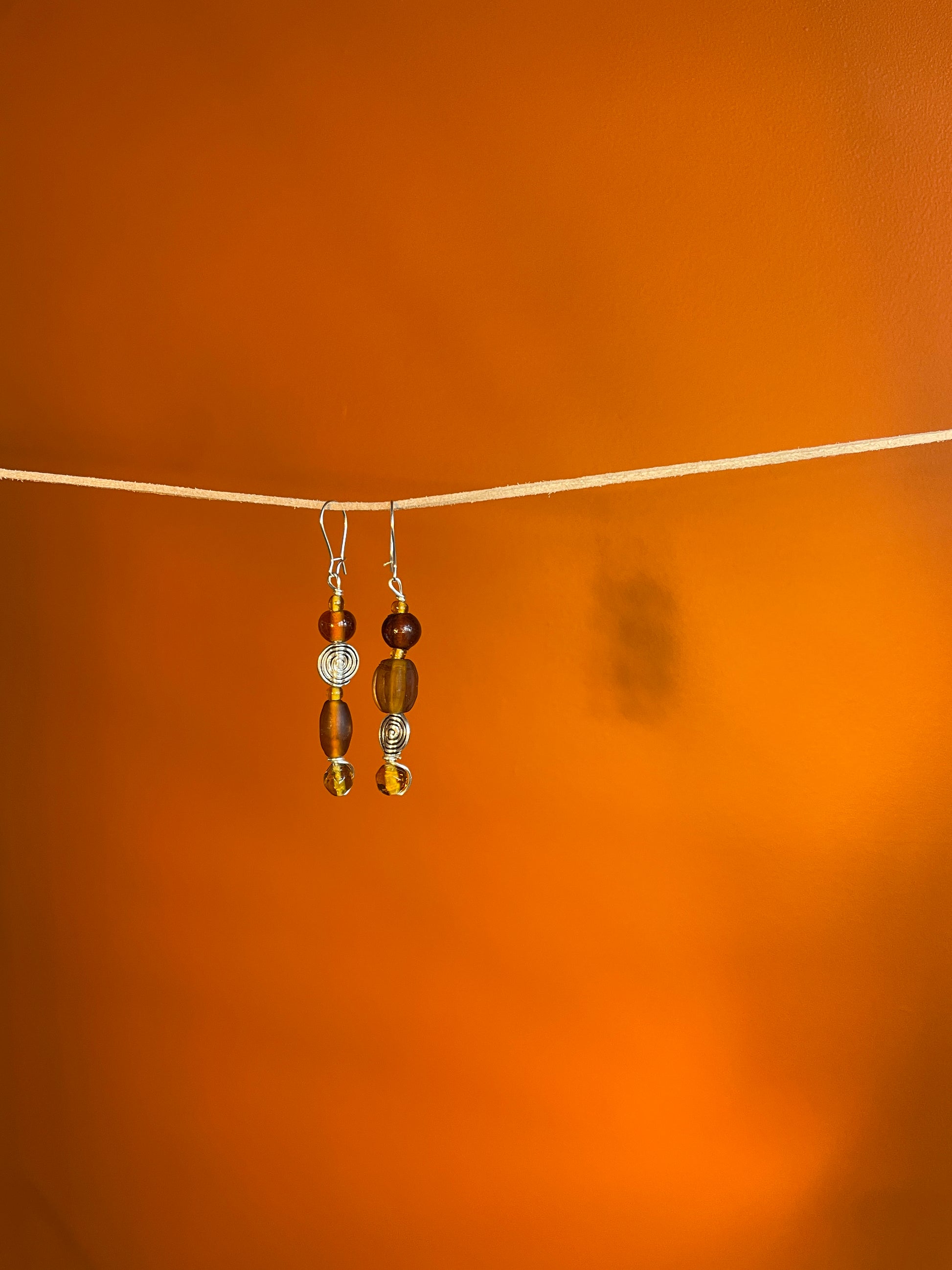 Handmade earrings crafted with silver plated wire, handmade glass beads and silver plated spiral beads.