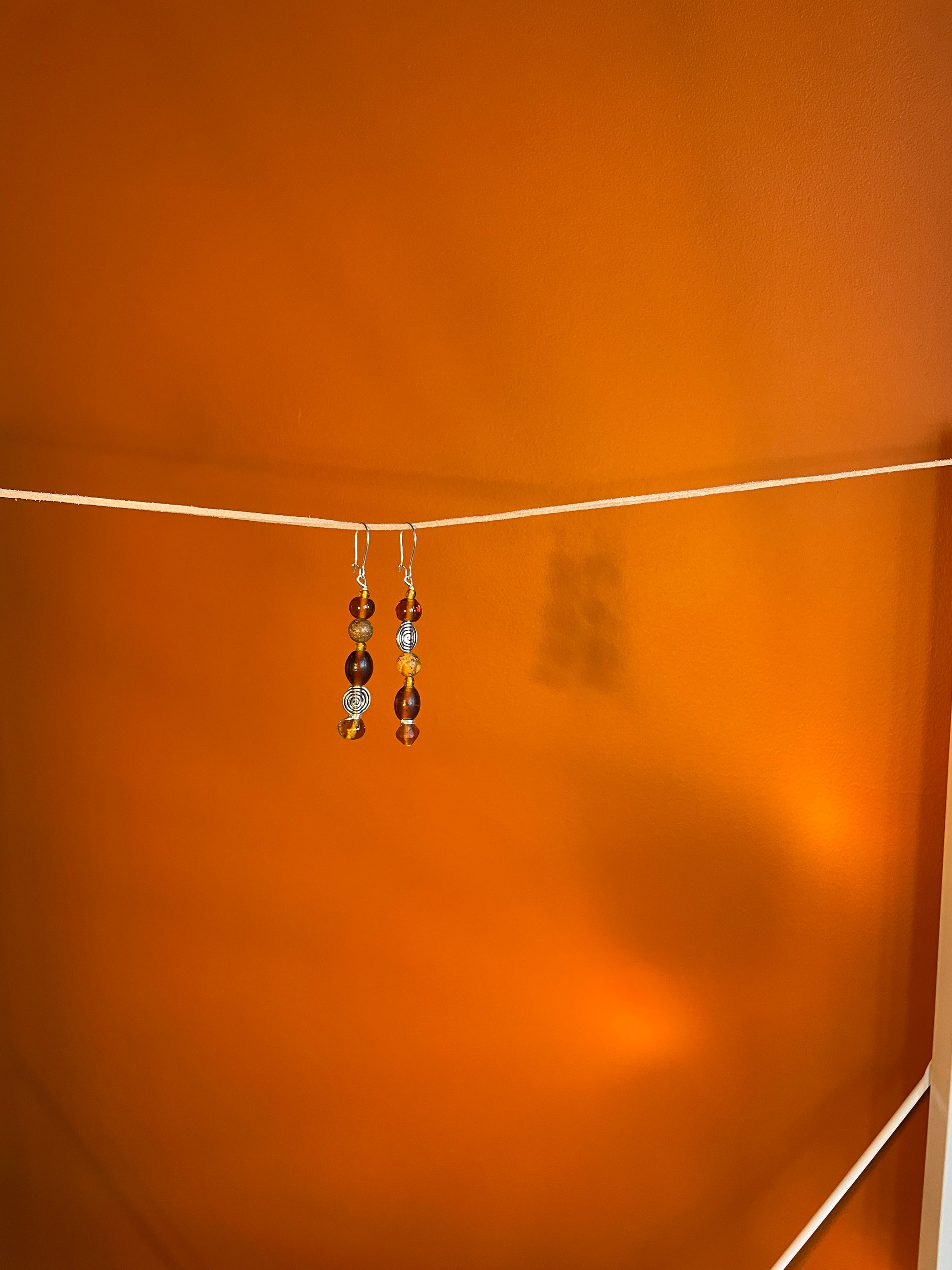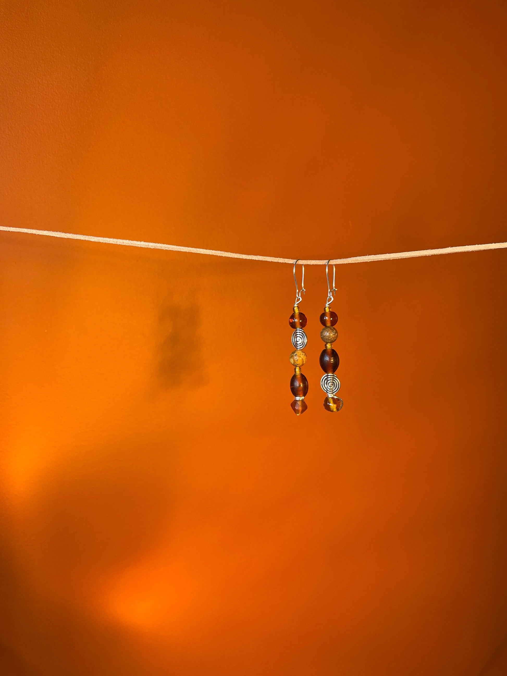 Handmade earrings crafted with silver plated wire, handmade glass beads, semi-precious Picture Jasper and silver plated spiral beads.